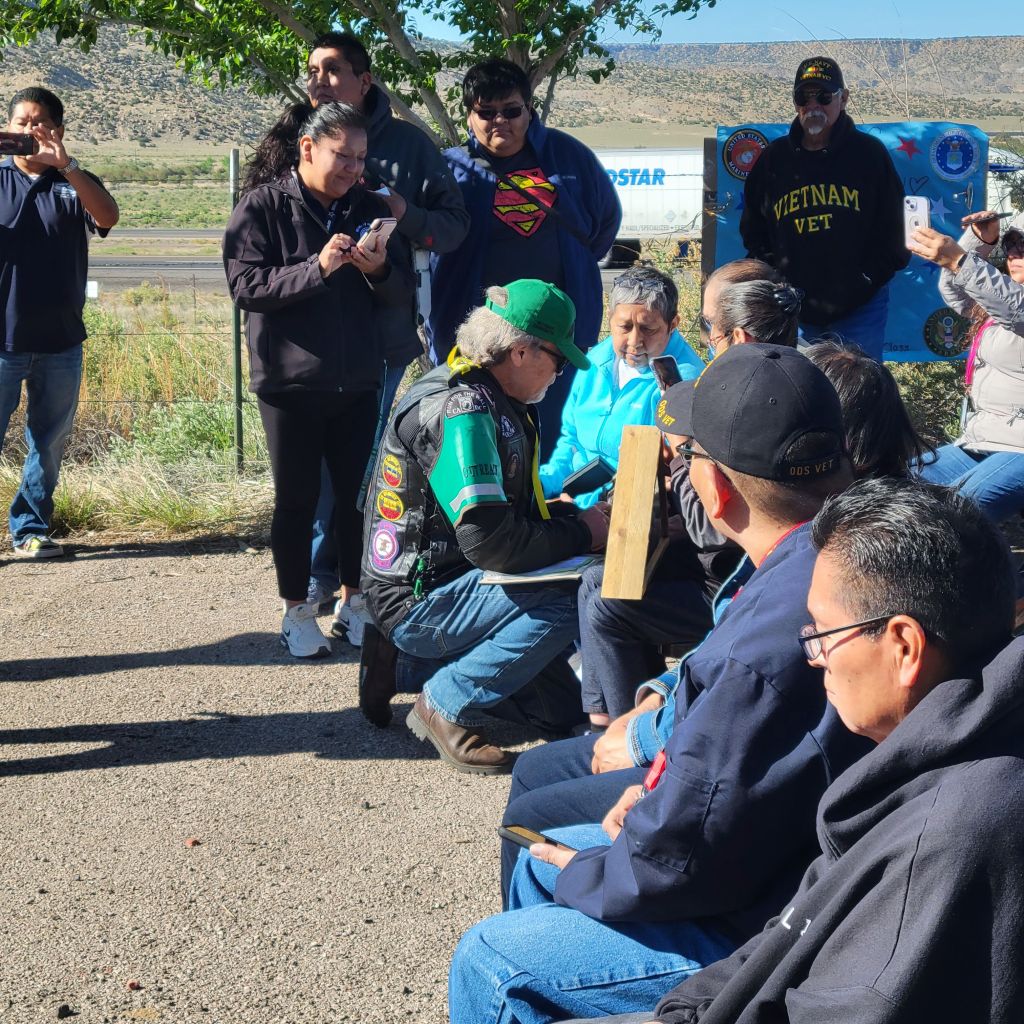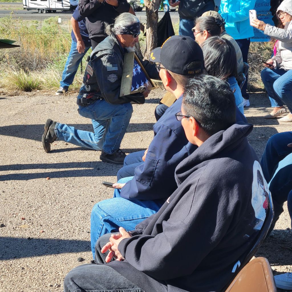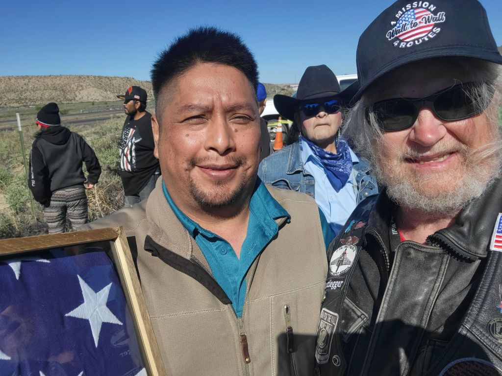 There was a young teenage girl who belted out a great rendition of our Star Spangled Banner. More sunblock applied. I hear it’s about 15 degrees cooler in Gallop. 90 minus 15 equals 75 I am not donning heavy. I go for it in the long sleeve moisure wicking shirt. Soon it starts to rain. Sweat, rain and sunblock in one eye. Getting colder and now it’s really raining. 20 more miles to Gallup. Finally a one eyed motorcyclist rides to town.