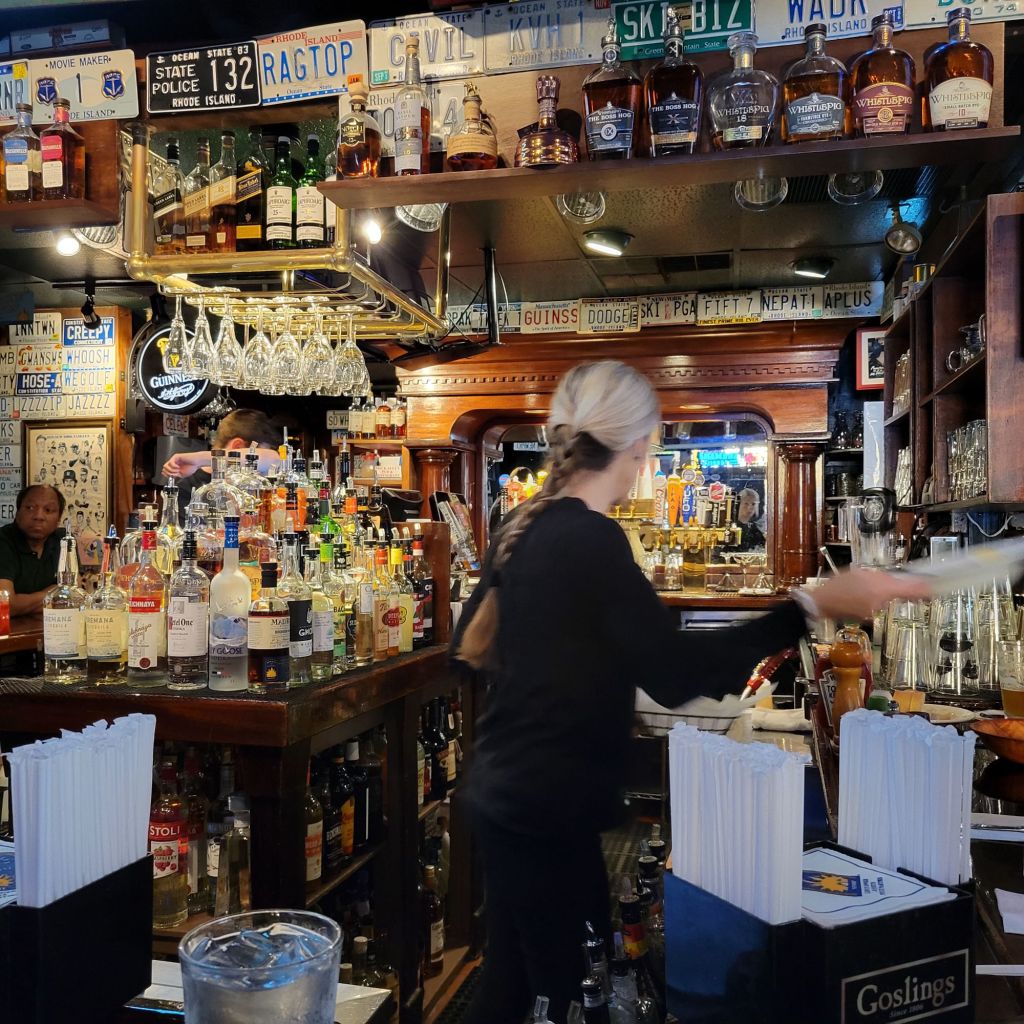 John F and Jackie married here. Americas cup winner was floating in the bay. A lot of wealthy from the industrial built summer cottages hete. Now a place for the new rich. The guy that invented Spandex bought Goat Island. After a tour of the harbour it was time for daily meal. Lunch at Brick Alley Pub & Restarant.