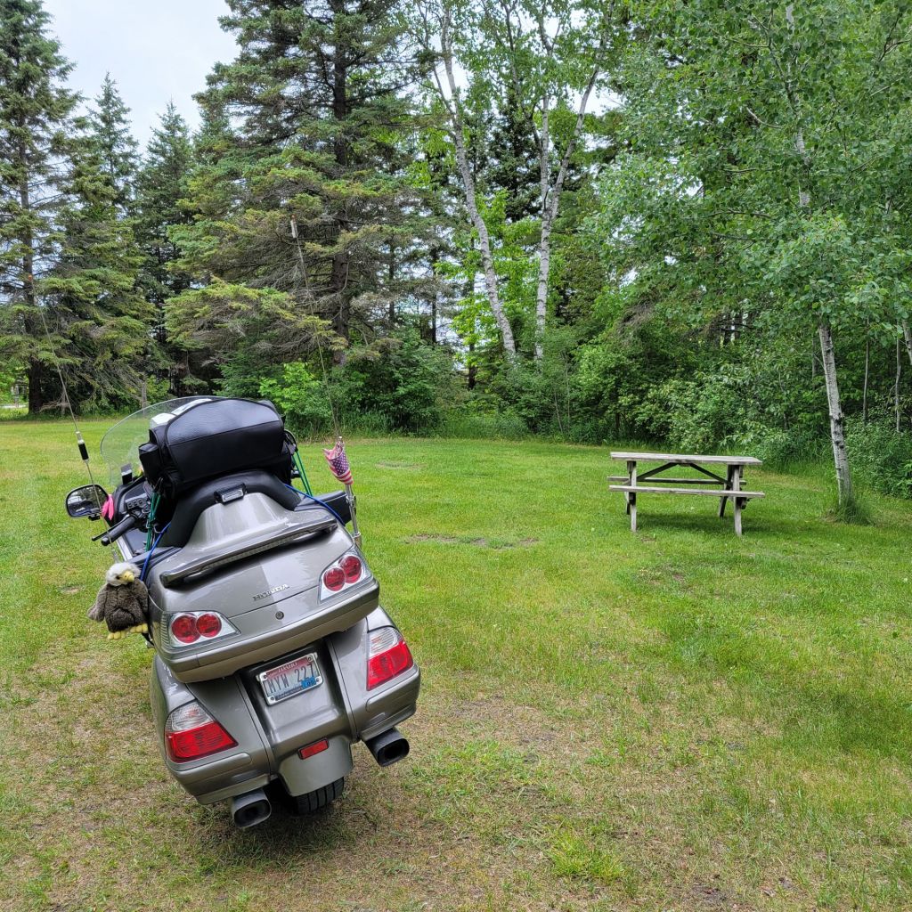 Ended up just across the border in Minnesota. State park had a wonderful campground. I was at the point where ever there may be a place to rest my weary head I was ready. Weather all day was as perfect as it could be. While trying to check into the heavely forested campground the mosquitos were out. Of course the only way to check is via the web.